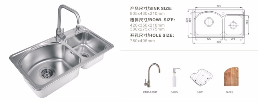 | Size | Sink size :805x430x210mm, bowl size :420x350x210mm,300x275x175mm, hole size:780x405mm |